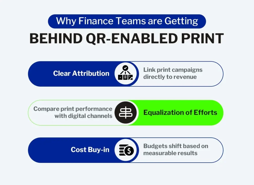 CFOs prefer marketing channels that provide measurable results. QR-enabled print campaigns generate trackable engagement data such as scans, user behavior, and conversions, allowing finance teams to connect offline marketing activities with measurable business outcomes and revenue impact.