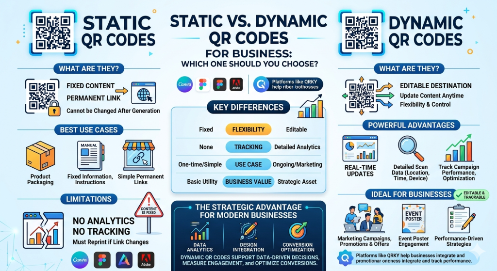 In static vs dynamic QR code decisions, static codes are useful for simple, permanent links, while dynamic QR codes are better for campaigns that may change over time. QRKY helps students explore both options and apply them in real-world business scenarios.